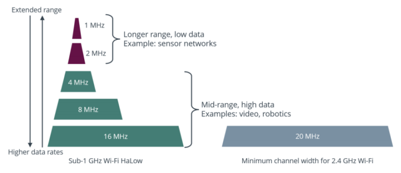 En Europe, HaLow opère typiquement autour de 868 MHz avec des contraintes réglementaires sur la puissance et le duty cycle. Le choix de la largeur de canal est fondamental. Les canaux étroits de 1 ou 2 MHz maximisent la portée et la robustesse mais limitent le débit global. Les canaux plus larges augmentent la capacité mais réduisent la portée et la tolérance au bruit.